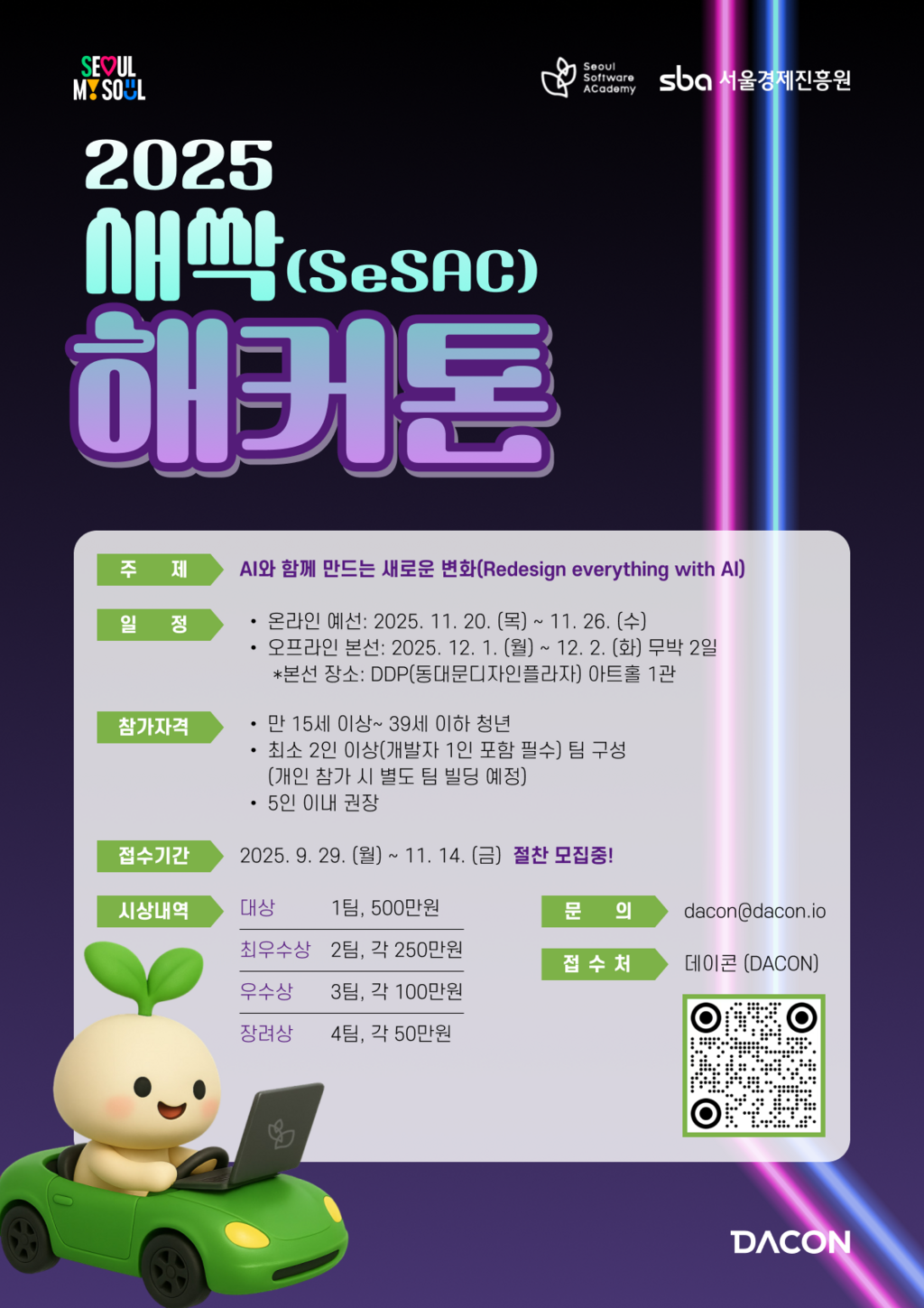 A. IT 기술 분야에 관심있는 기획자, 디자이너, 개발자 청년들이 모여 서울의 미래를 바꿀 아이디어를 기획하고 서비스로 구현하는 해커톤입니다. 서울시 SW교육 브랜드 청년취업사관학교(SeSAC)가 기획하고 운영합니다.