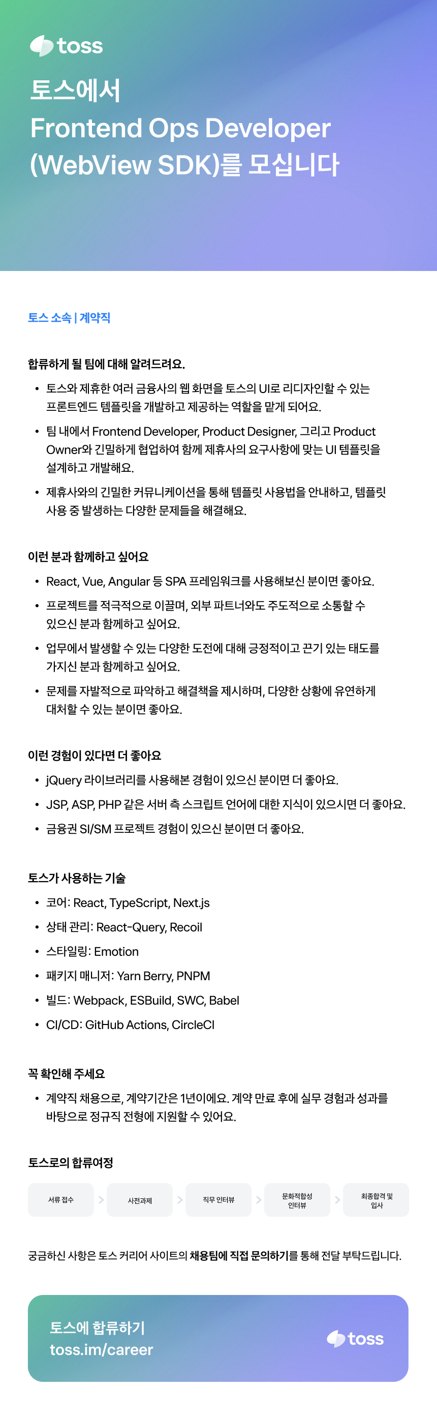 [토스] Frontend Ops Developer (WebView SDK) 채용중!