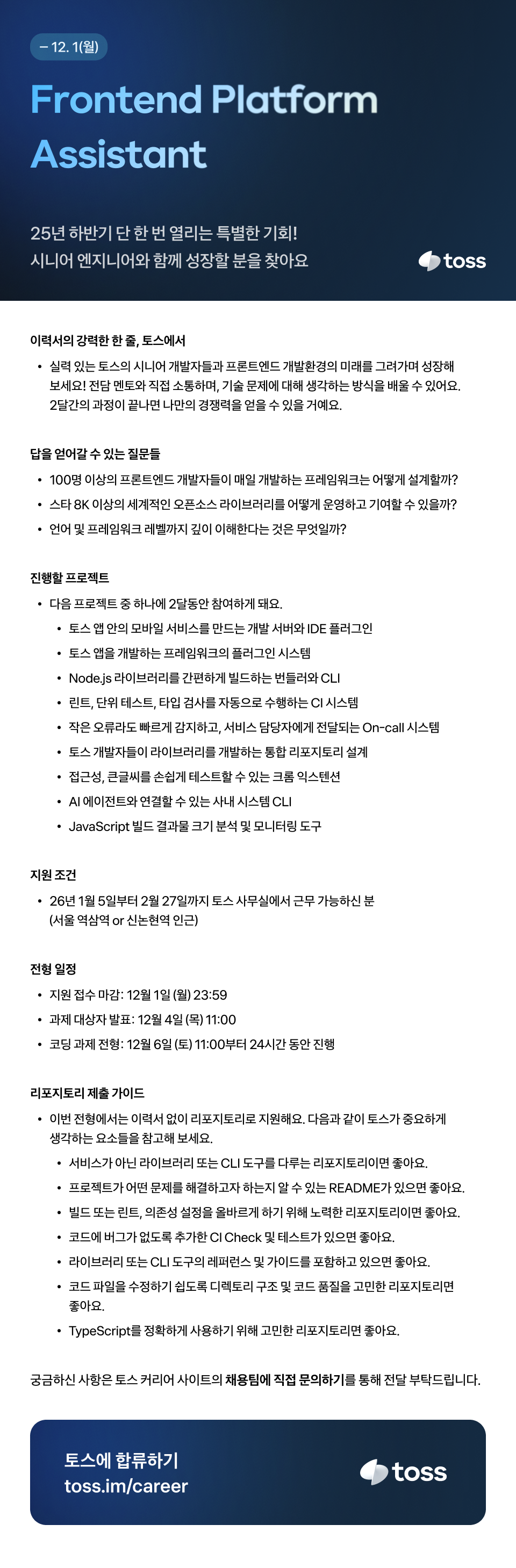 [토스 25년도 2학기 Frontend Platform Assistant 모집]