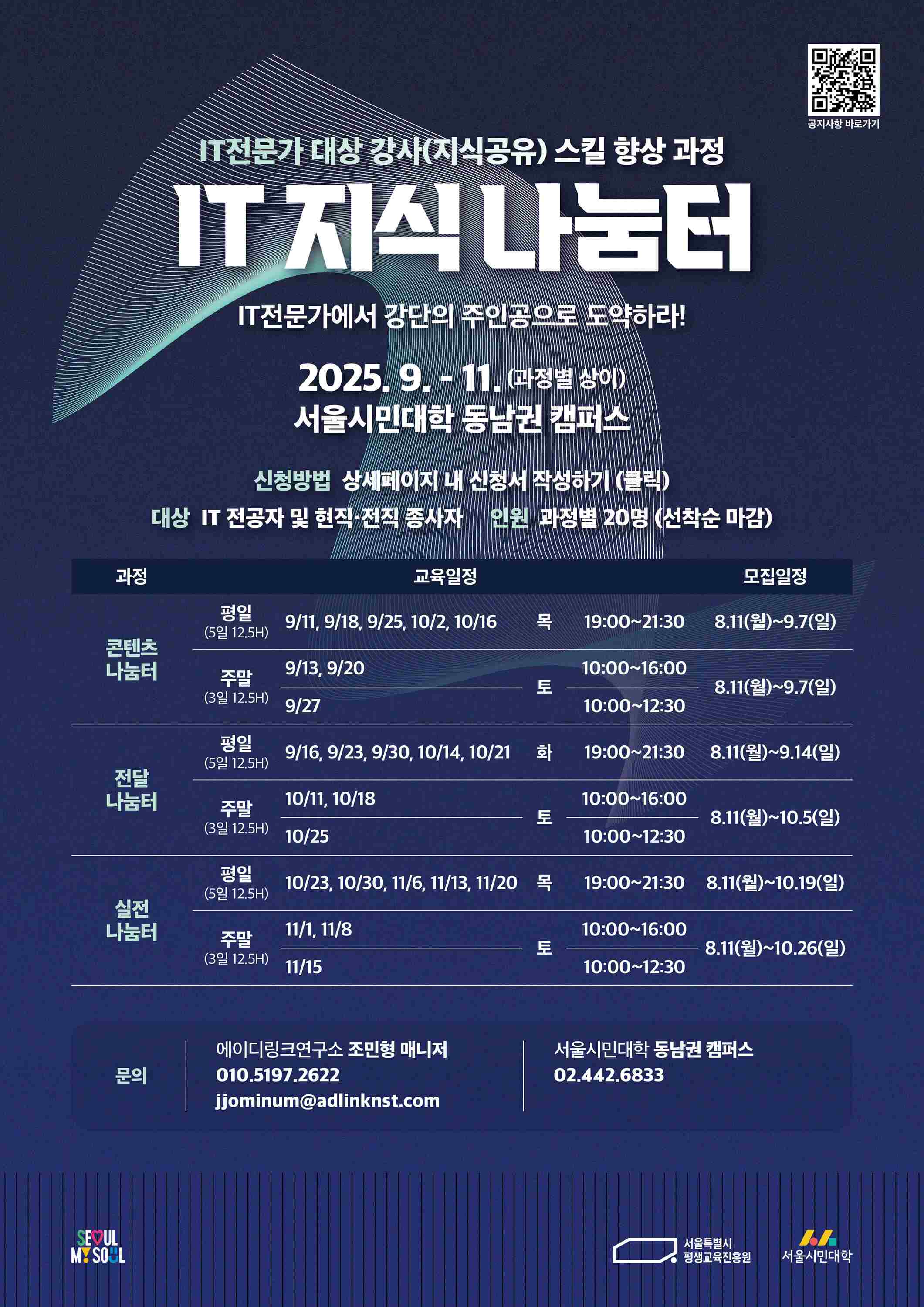 서울특별시평생교육진흥원은 다양한 전문성을 활용하여 생애 전환을 지원하고 지식공유 문화를 확산하기 위해 IT 전문가(전공자, 현직·전직 종사자) 대상 강사(지식공유) 스킬 향상 과정 를 운영하고자 합니다. IT 분야에서 쌓아온 경험과 전문성을 기반으로 교육 역량 강화를 제공하는 참여자를 모집하오니 많은 참여 바랍니다.