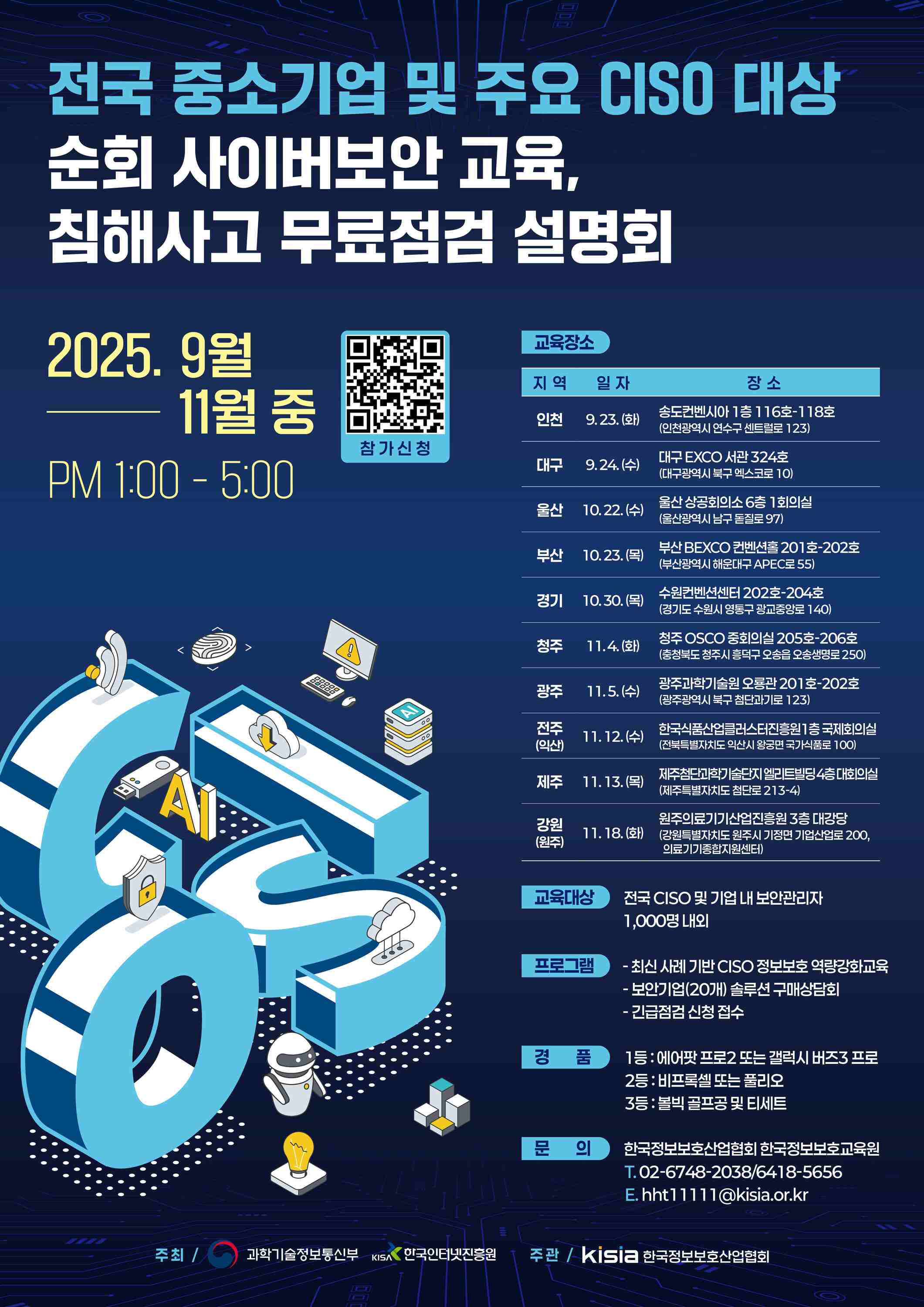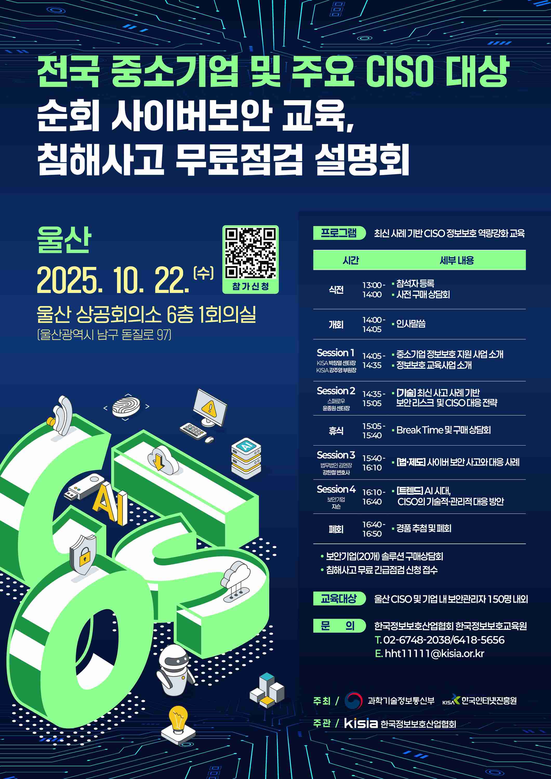 📢 과학기술정보통신부와 한국인터넷진흥원이 주최하며 한국정보보호산업협회가 주관하는「전국 중소기업 및 주요 CISO 대상 사이버보안 교육·침해사고 무료점검 설명회」참가자를 모집합니다.