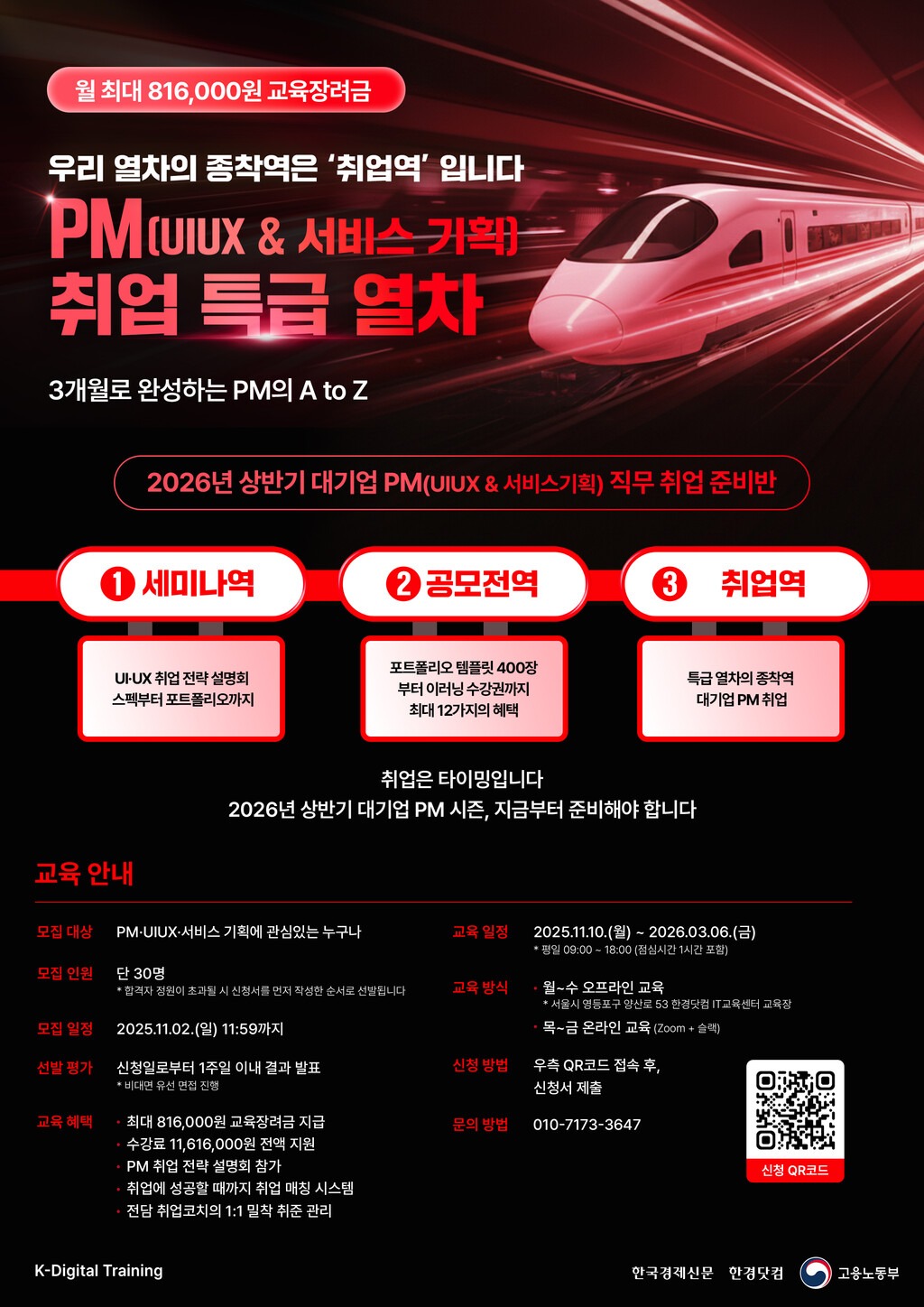 - 교육비용: 내일배움카드 발급 시 0원 (1,161만원 전액 국비 지원) (+매월 훈련장려금 월 최대 81만원 지급)