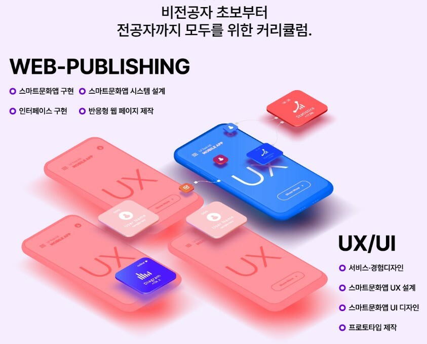 UIUX 반응형 웹디자인 & 웹퍼블리셔(디자인·코딩) 양성과정은 최신 트렌드의 UIUX 디자인과 웹표준 기반 퍼블리싱 기술을 함께 배우는 실무 중심 교육입니다. 피그마(Figma)를 활용한 사용자 경험 설계부터 반응형 웹페이지 제작, 프로토타입 테스트, 웹 코딩까지 전 과정을 체계적으로 다루며, 실무 프로젝트를 통해 실제 웹서비스 개발 과정 전반을 경험할 수 있습니다.