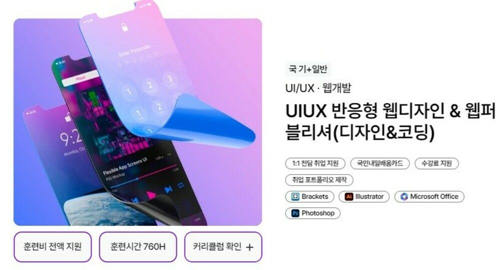 본 과정은 총 760시간(95일)의 집중 교육으로, 웹·앱 서비스 디자인 역량은 물론 HTML/CSS 기반의 반응형 페이지 구현 능력까지 갖춘 웹디자이너·UIUX 디자이너·웹퍼블리셔로의 성장을 목표로 합니다. 실무교재와 프로젝트 기반 수업을 통해 포트폴리오를 완성할 수 있으며, UIUX 구조 설계 및 사용자 테스트 등 기업 실무에 필요한 핵심 능력을 자연스럽게 익힐 수 있습니다.