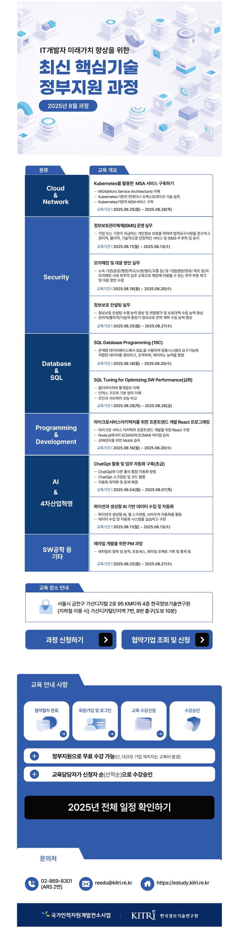 한국정보기술연구원의 2025년 8월 재직자 역량 강화 교육과정 안내드립니다.