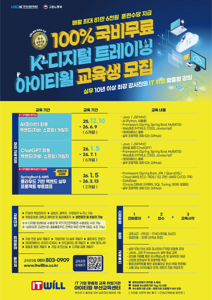 ★ 고용노동부 우수훈련기관 아이티윌 부산교육센터 IT취업반 모집