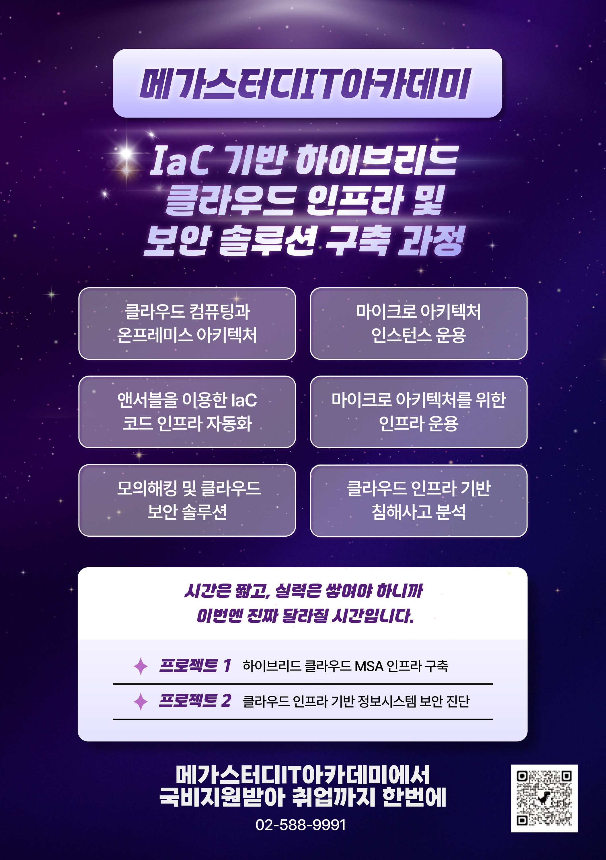 📍 종합적 보안학습, 최신기술 트렌드 반영, 최신 보안 패러다임, 하이브리드 클라우드, 인프라 관리와 자동화 등 종합적인 보안진단 프로젝트를 경험할 수 있습니다.