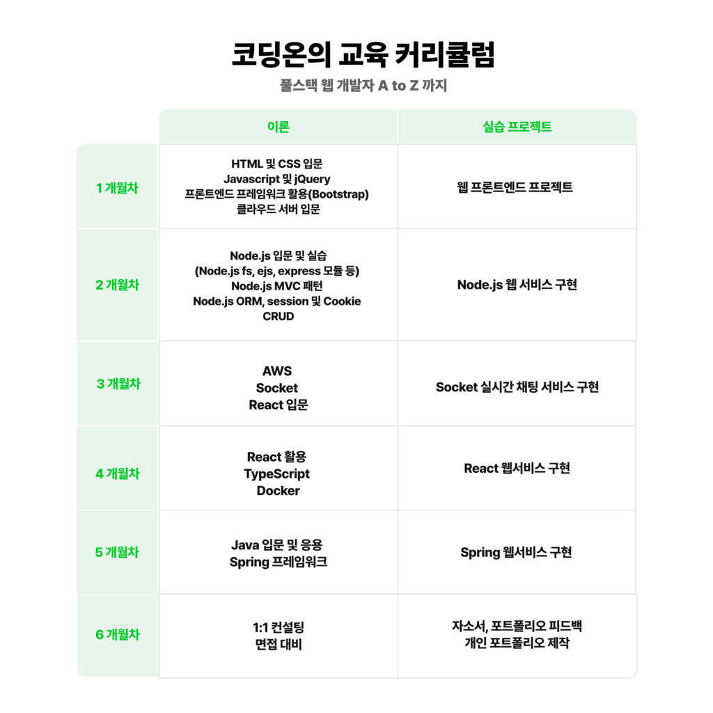 ## **[POSCO x CODINGOn K-Digital Training] 포스코 풀스택 웹 개발자 양성 8기** 📑 사업명 : K-Digital Training 📑 과정명 : 웹 개발자 입문 과정 부트캠프 8기 📑 모집 대상 - 국민내일배움 카드 발급이 가능한 분 - 웹 개발자를 꿈꾸는 누구든지 OK 📑 모집 일정 : ~ 2023.06.14(수) 📑 면접 평가 : 2023.06.19(월) ~ 2023.06.23(금) 📑 최종 합격자 발표 : 2023.06.23(금) 📑 교육일정 <타임 1> - 개강일 : 2023.07.03(월) - 종강일 : 2023.12.23(토) - 수업 시간 : 월 ~ 토 09:00 ~ 14:00 (일 5시간, 6개월) <타임 2> - 개강일 : 2023.07.03(월) - 종강일 : 2023.12.22(금) - 수업 시간 : 월 ~ 금 14:30 ~ 20:30(일 6시간, 6개월) 📑 수업 방식 : 오프라인 📑 교육장소 : 서울시 마포구 숭문 4길 6, B1 코딩온 교육장 📑 교육생 특전 - 훈련비 13,068,000원 상당 전액 지원 - 훈련 장려금 6개월간 최대 1,896,000원 지원 - 취업 연계 지원 📑 모집 정원 : 60명 내외 📑 안내 페이지 : https://codingon.co.kr/pr/kdt/8th 📑 지원방법 -구글 폼을 통한 접수 : https://forms.gle/cmhkXexuJhsADmYH7 상세 문의: 카카오톡 채널 @codingon ※ 교육 신청을 위해서, 교육 지원폼 내용을 정확히 작성 부탁드립니다.