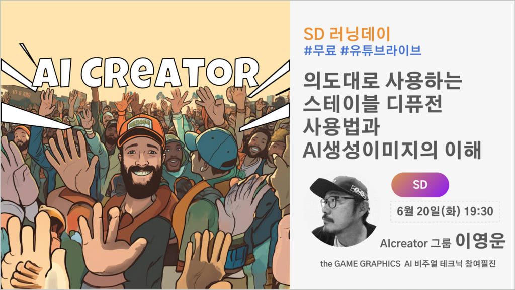 여러 이미지 생성AI 툴🖼️🤖 중에 스테이블디퓨전은 자유도가 높고 강력하지만 그만큼 의도대로 사용하려면 여러가지 기법들이 필요합니다. AIcreator 그룹의 운영자이시고 [the GAME GRAPHICS : AI 비주얼 테크닉] 집필진이신 이영운님을 모시고, "의도대로 사용하는 스테이블디퓨전 사용법과 AI생성이미지의 이해"라는 주제로 아래와 같이 세미나를 개최합니다. 많은 관심부탁드립니다.📢 🗓️ 일시 : 6/20(화) 19:30 ~ 20:30 📺 장소 : 온라인 📝 참가신청 : [https://aifactory.space/competition/2202/discussion/430](https://aifactory.space/competition/2202/discussion/430) ✨
