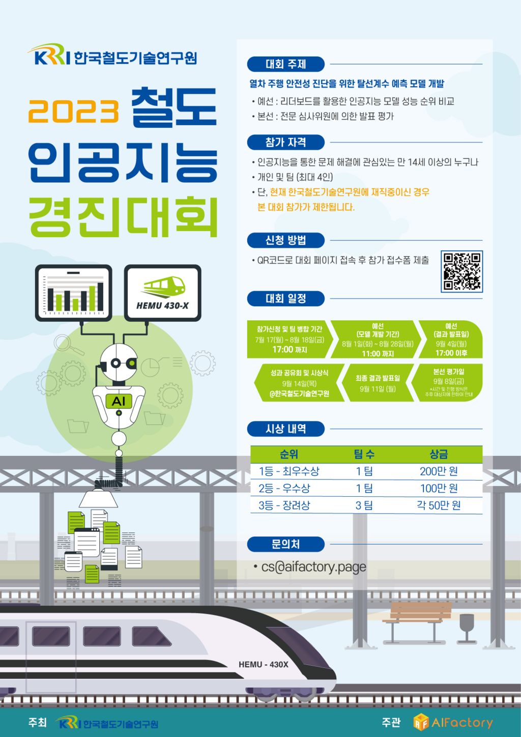 ○ 참가접수 - 대회 안내 및 참가신청서 : [https://aifactory.space/competition/2511/discussion/504](https://aifactory.space/competition/2511/discussion/504) ○ 대회주제 - 열차 주행 안전성 진단을 위한 탈선계수 예측 모델 개발 ○ 주최/주관 - 주최 : 한국철도기술연구원 (Korean Railroad Research Institute) - 주관 : 인공지능팩토리(AIFactory) ○ 참가자격 - 인공지능 모델 개발에 관심있는 만 14세 이상 누구나! - 개인 및 팀 (최대 4인) - 단, 현재 한국철도기술연구원에 재직중이신 경우 본 대회 참가가 제한됩니다. ○ 대회 일정 - 참가신청 및 팀 병합 기간 : 7월 17일 (월) ~ 8월 18일 (금) 17:00 - 예선 모델 개발 기간 : 8월 1일 (화) 10시 ~ 8월 28일 (월) 11:00 - 본선 진출팀 발표일 : 9월 4일 (월) 17시 이후 - 본선 발표 평가일 (온라인 진행) : 9월 8일 (금) - 최종 결과 발표일 : 9월 11일 (월) - 성과 공유회 및 시상식 (오프라인) : 9월 14일 (목) - 상기 일정은 원활한 대회 운영을 위하여 변경될 수 있으며 변경 시 별도 안내드립니다 ○ 상금(총 상금 450만원, 한국철도기술연구원에서 발급되는 상장 수여) - 1등 | 최우수상 : 200만원, 1팀 - 2등 | 우수상 : 100만원, 1팀 - 3등 | 장려상 : 각 50만원, 3팀 ○ 문의 - cs@aifactory.page !