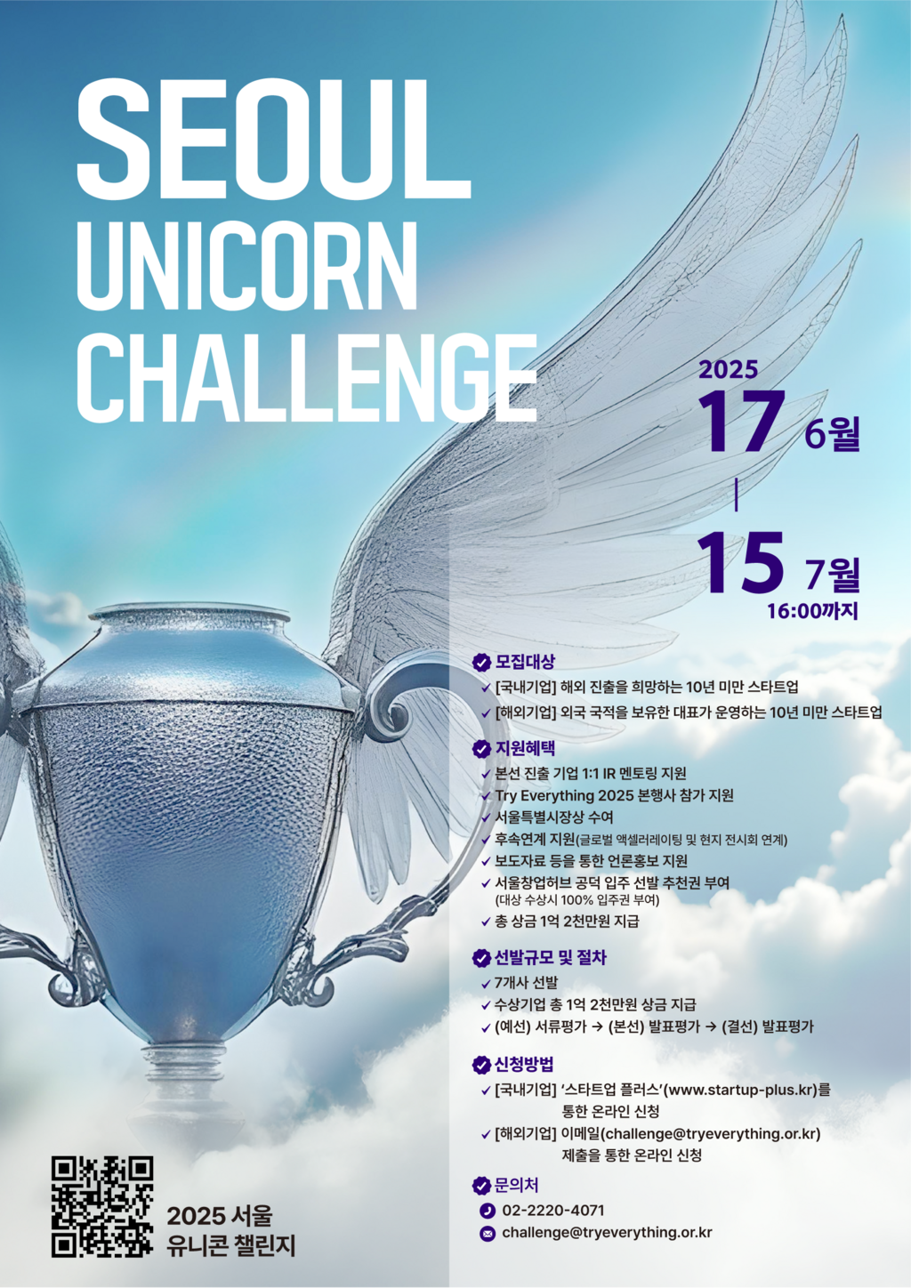 “2025 서울 유니콘 챌린지”는 높은 잠재력을 지닌 국내외 스타트업을 발굴하고, 국내외 시장 진출 및 확장을 촉진하는 글로벌 창업 무대입니다🤩